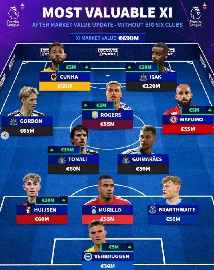 直播吧6月1日讯 德转此前更新了英超球员身价,并盘点了除Big6球队之外英超最贵阵容,纽卡4将在列,具体如下:
